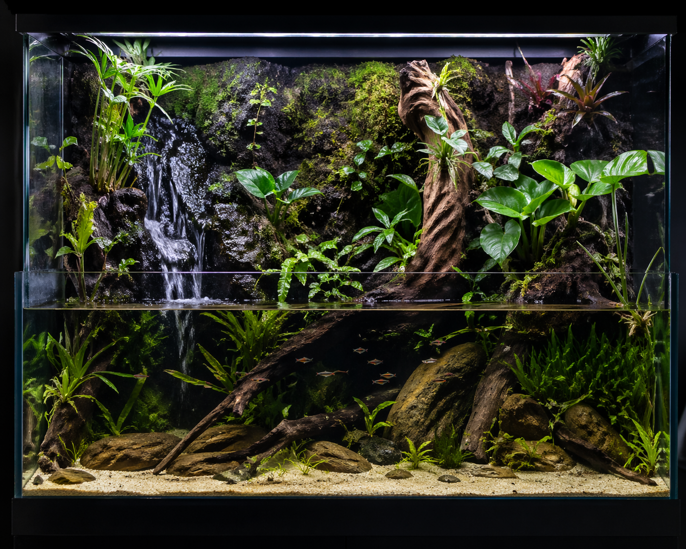 Many paludariums incorporate small waterfalls or flowing streams that mimic natural environments. These features improve water circulation while enhancing the aesthetic and auditory experience of the display. Proper filtration ensures that the aquatic ecosystem remains stable and healthy.