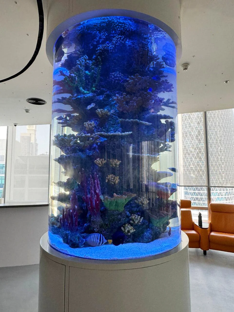 Project overview: Design and installation of an acrylic cylinder aquarium for an office in Dubai. The aquarium has a custom built artificial coral reef with wide range of fish.