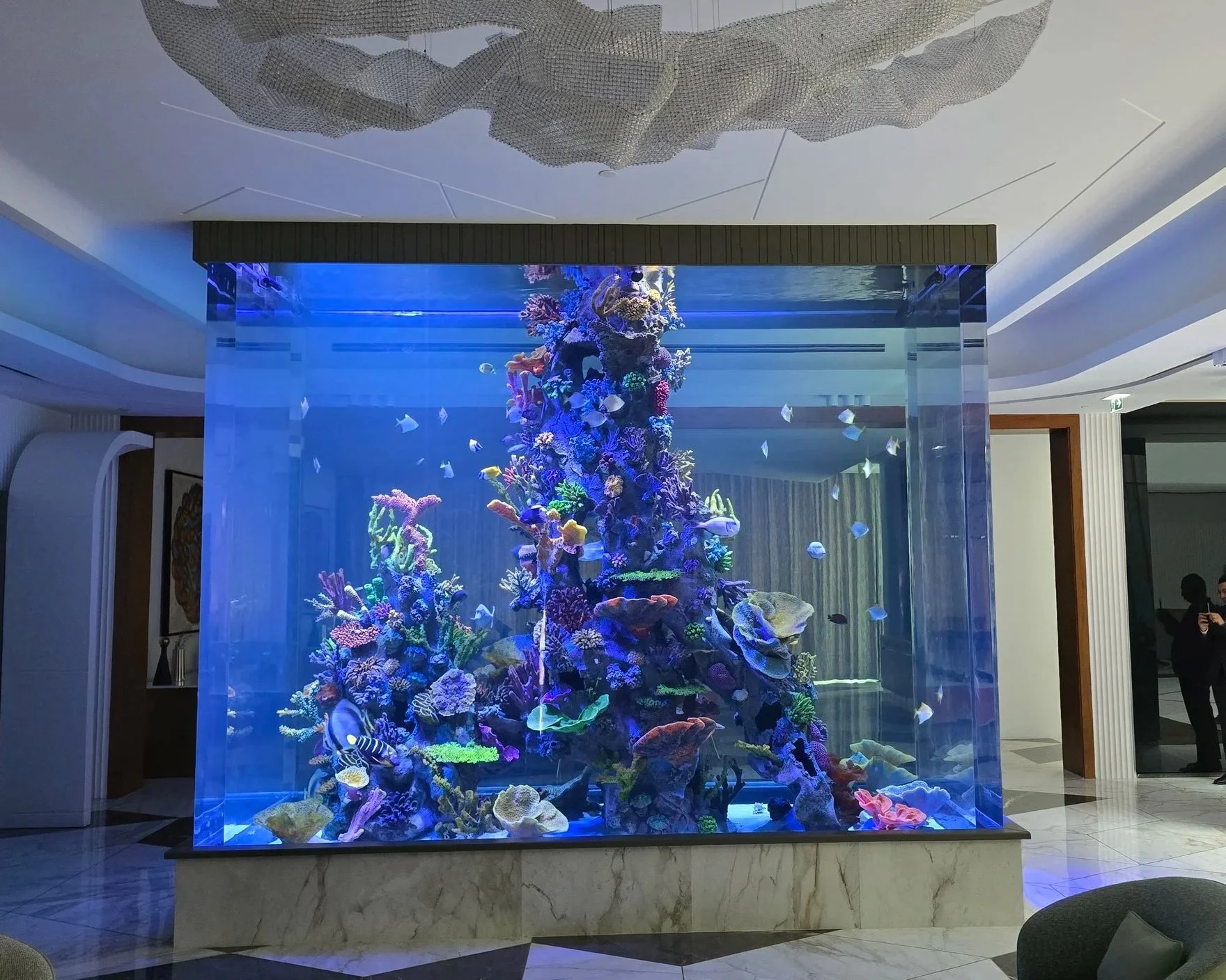 The installation process included several complex steps. The massive tank had to be lifted and carefully maneuvered through the construction site using heavy-duty rollers. Filtration equipment needed precise positioning, followed by intricate plumbing and electrical work. Finally, the artificial rock and coral decorations were placed inside the tank, creating an engaging underwater landscape.